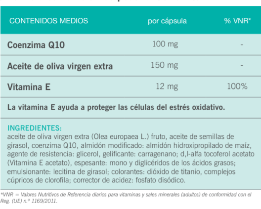 Cápsulas softgel compuestas por Coenzima Q10, aceite de oliva virgen extra y vitamina E.