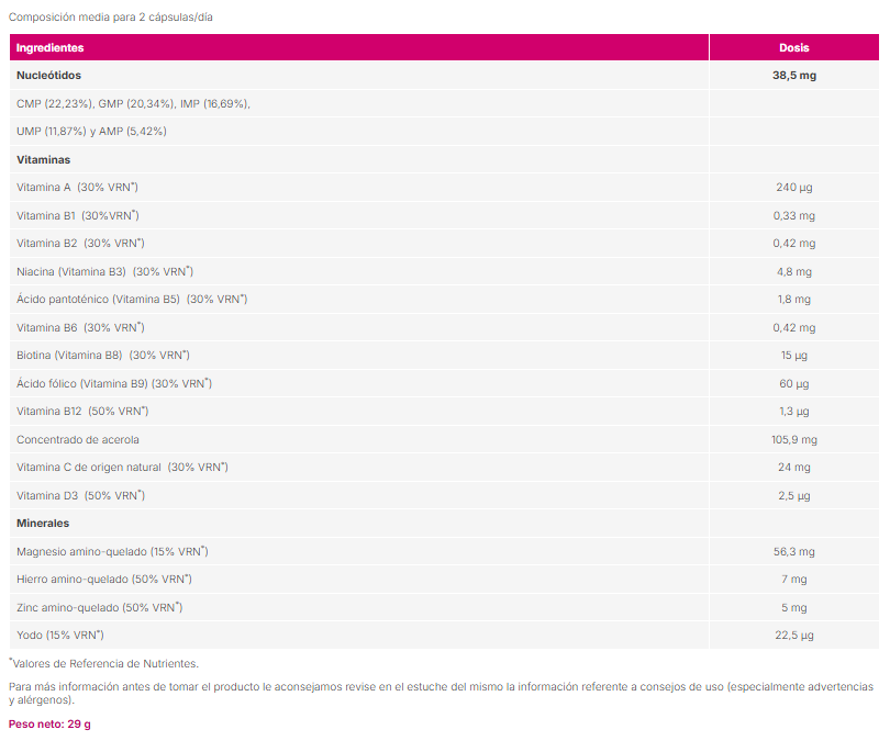 Contribuye al equilibrio nutricional con una ingesta óptima de 11 vitaminas, incluida la vitamina C de origen natural y 4 minerales específicos, incluido el hierro.